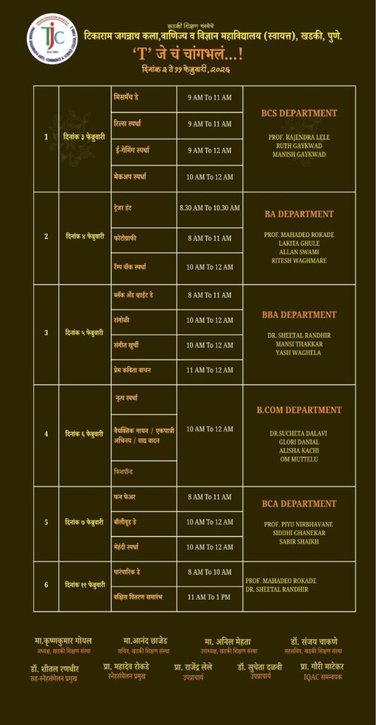 महाविद्यालयातील सर्व विद्यार्थ्यांना कळविण्यात अत्यंत आनंद होत आहे की आपल्या महाविद्यालयाचे वार्षिक स्नेहसंमेलन 2026 ‘टि जे चं चांगभलं ‘ Annual Gathering लवकरच म्हणजे 3 फेब्रुवारी ते 11 फेब्रुवारी 2026 या कालावधीमध्ये होणार आहे. या कालावधीमध्ये विद्यार्थ्यांनीच सुचवलेले आणि विद्यार्थ्यांनीच सर्व प्रकारे नियोजित केलेले कार्यक्रम पुढे दिलेल्या वेळापत्रक प्रमाणे असतील. त्यानंतर 11 फेब्रुवारी या तारखेला पुरस्कार वितरण सोहळा असेल तरी जास्तीत जास्त विद्यार्थ्यांनी या उपक्रमात सहभागी व्हावे. सर्व सहभागींना प्रमाणपत्र त्याचप्रमाणे दोन क्रेडिट मिळणार आहेत. नावनोंदणी सुरू झाली आहे.नावनोंदणीसाठी संबधीत विभागात भेट द्या.